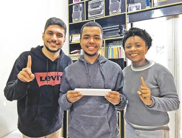 Reprodução/Foto-RN176 Renan exibe o indicador de “número 1”, orgulho dos membros Soka do Rio de Janeiro, em cena também na conversão do amigo Gabriel, hoje responsável pela Juventude Soka de comunidade