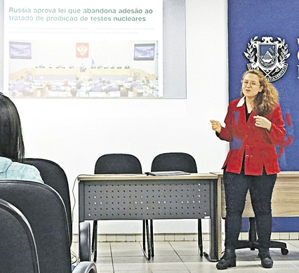 Reprodução/Foto-RN176 Andressa explica os impactos das armas nucleares no meio ambiente para os participantes de congresso. Foto: Arquivo pessoal