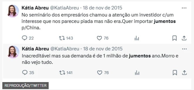 Reprodução/Foto-RN176 ‘Morro e não vejo tudo’, escreveu a então ministra de agricultura Kátia Abreu, em 2015, ao comentar no Twitter a demanda chinesa por jumentos para exportação