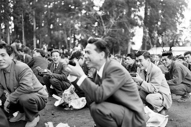 Reprodução/Foto-RN176 Participantes da cerimônia do Dia 16 de Março apreciam a sopa de leitão oferecida em sua chegada ao local (Japão, mar. 1958)