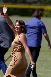Reprodução/Foto-RN176 Michelle Bolsonaro, esposa do presidente brasileiro Jair Bolsonaro, acena após encontro com apoiadores que se manifestam para comemorar o aniversário do presidente no Palácio da Alvorada, em Brasília Foto: Adriano Machado / Reuters