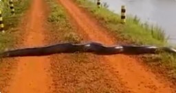 Sucuri gigante vira ‘quebra-molas vivo’ ao atravessar estrada; assista