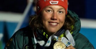 ROTANEWS176 31/07/2025 17:39 Reprodução/Foto-RN176 Terceira colocada, a alemã Laura Dahlmeier posa durante a cerimônia de entrega de medalhas da prova de sprint…