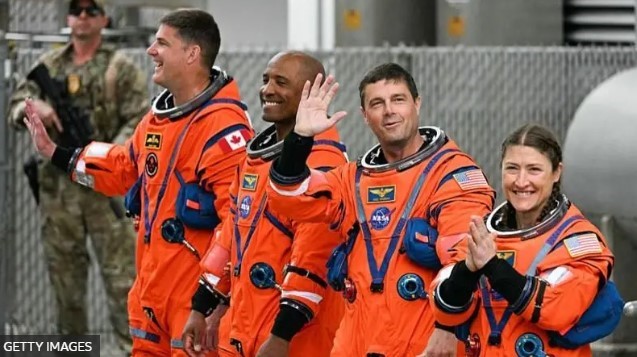 Reprodução/Foto-RN176 Astronautas chegam ao local de lançamento da missão Artemis 2 na Flórida – Crédito,Getty Images