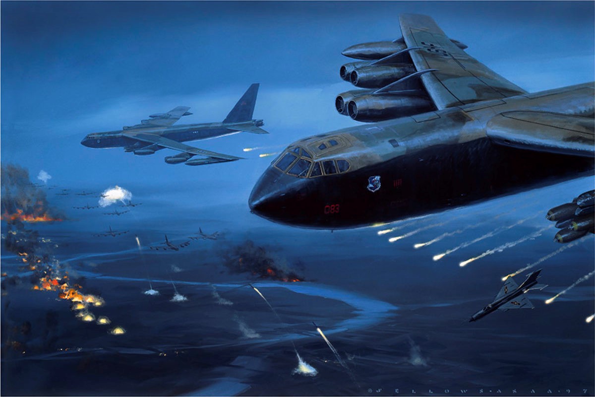 RN176 Os B-52s executam uma série de ataques noturnos, com SAMs e um MiG-21 na defesa,na pintura de Jack Fellows “High Road to Hanoi”.