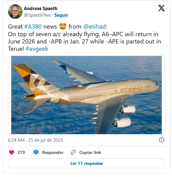 O jornalista especializado em aviação Andreas Spaeth confirmou que o jato de matrícula A6-APC retornará aos céus em junho de 2026, enquanto o A6-APB tem reativação prevista para janeiro de 2027.