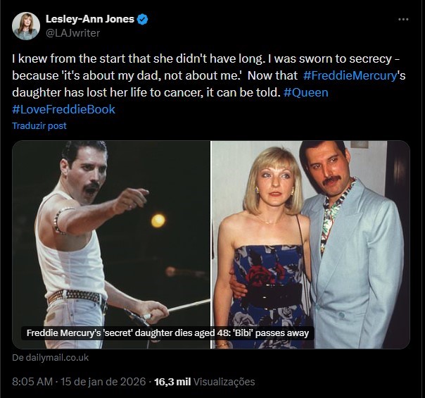 A mulher que chocou o mundo no ano passado após ter afirmado ser filha de Freddie Mercury (1946-1991), vocalista do “Queen”, morreu aos 48 anos, vítima de um câncer nos ossos. Identificada somente como “Bibi”, a jovem teve sua existência revelada no livro “Love, Freddie”, da jornalista Lesley-Ann Jones, como fruto de uma relação extraconjugal do músico.