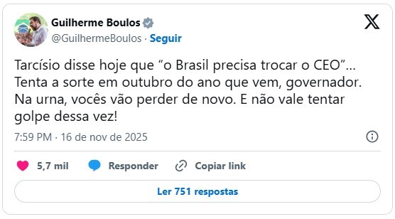 No entanto, Guilherme Boulos não gostou nada de ouvir tal declaração e usou as redes sociais para ‘bater na cara do rival político’, chegando a desafia-lo nas Eleições de 2026: “Tarcísio disse hoje que ‘o Brasil precisa trocar o CEO’… Tenta a sorte em outubro do ano que vem, governador. Na urna, vocês vão perder de novo. E não vale tentar golpe dessa vez!“, disparou ele, chegando a citar Jair Bolsonaro (PL) de forma indireta.