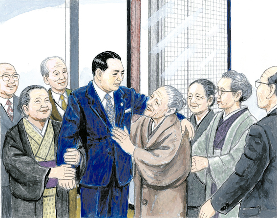 Reprodução/Foto-RN176 Ilustração retrata Ikeda sensei agradecendo e incentivando senhoras veteranas da SokGakkai da região de Kansai (nov. 1978). Ele era um filósofo, escritor, fotógrafo, poeta e líder budista da SGI atualmente o Mestre e Presidente da Soka Gakkai Internacional – SGI – Foto: Seikyo Press
