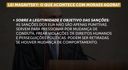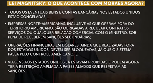 A lei Magnitsky aplicada contra Moraes foi aprovada em 2012, durante o governo de Barack Obama, e prevê sanções como o bloqueio de contas bancárias e de bens em solo norte-americano, além de visto cancelado e proibição de entrar no país.