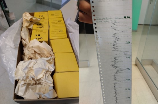 b) Os dados estão em rolos de papel, totalizando 9 rolos, e não há registro digital dos mesmos.