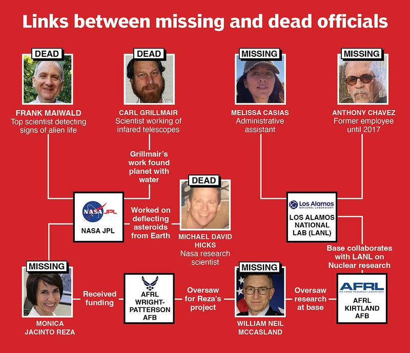 Como resultado, foi elaborado um mapa de cientistas e engenheiros ligados a laboratórios de materiais exóticos. São mentes brilhantes que teriam trabalhado em métodos de propulsão inspirados por tecnologia não humana e que, uma a uma, desapareceram tragicamente ou inexplicavelmente da vista do público.