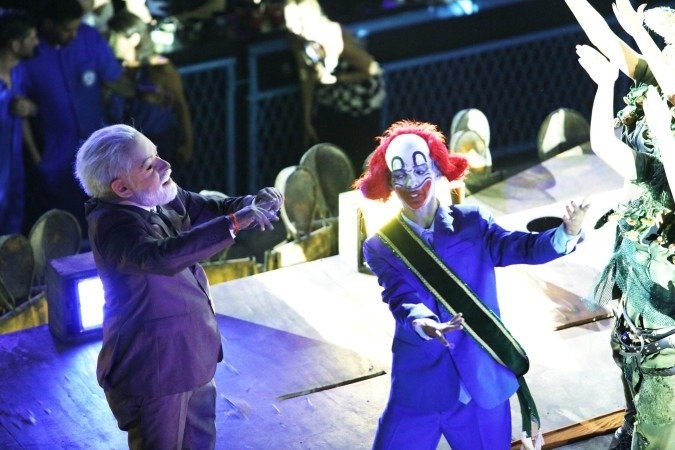 RN176 Da dir., para esq., ambos sambando: palhaço Bozo representando o ex-presidente Jair Messias Bolsonaro e um ator com a máscara do atual presidente Luiz Inácio Lula da Silva