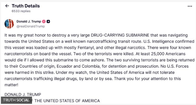 Mas, ao anunciar o ataque no Caribe contra um submarino no qual morreram duas pessoas, Trump escreveu na sua rede TruthSocial que “a inteligência americana confirmou que o navio era carregado principalmente com fentanil e outras drogas ilegais”.