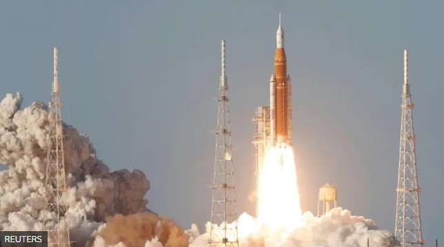 Reprodução/Foto-RN176 Artemis II decolou nesta quarta-feira, deixando um rastro de chamas e fumaça pelo caminho – Crédito,Reuters