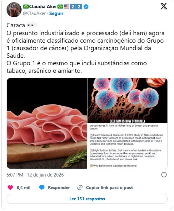 A organização ainda confunde algumas pessoas e as redes sociais não ajudam. Nesta semana, um post no X (antigo Twitter) viralizou ao frisar que o alimento e o tabaco pertencem ao mesmo grupo carcinogênicos da Iarc, logo, frequentemente a pergunta surge: “o presunto é tão cancerígeno que o tabaco?”.