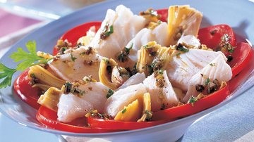 • Lave os tomates, corte-os ao meio, descarte as sementes e fatie a polpa. Escorra as alcachofras e corte-as em oito. Lave, seque e pique a salsa. Arrume numa saladeira os tomates, as alcachofras, a salsa e as postas de bacalhau.