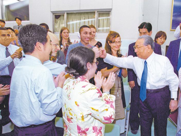 Reprodução/Foto-RN176 Presidente Ikeda cumprimenta integrantes da Divisão dos Jovens da SGI-Alemanha durante o Curso de Aprimoramento da SGI (Japão, set. 2002). Ele foi; pacifista, filósofo, escritor, fotógrafo, poeta e líder budista da SGI atualmente era o Mestre e Presidente da Soka Gakkai Internacional — Foto: Seikyo Shimbun