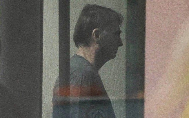 Reprodução/Foto-RN176 O ex-presidente Jair Bolsonaro, nor portão da sede da PF, neste domingo (23) – Reprodução/Folha de SP