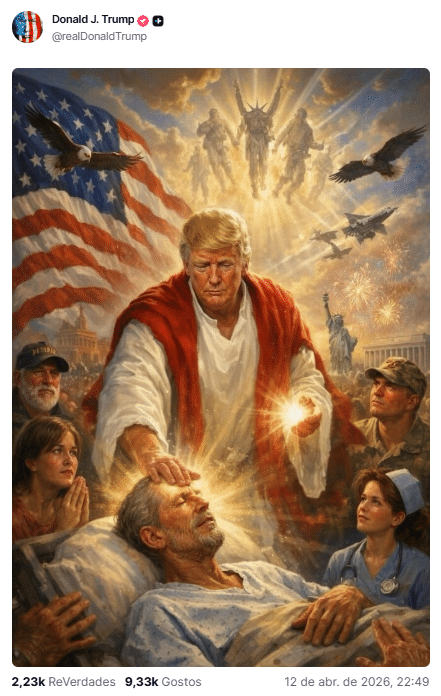 Depois da postagem com ataques ao papa, Trump publicou uma segunda peça, desta vez uma imagem em que aparece em destaque numa composição de forte apelo religioso. O gesto levou o embate para outro patamar ao combinar provocação política, simbolismo religioso e enfrentamento direto com o líder da Igreja Católica.
