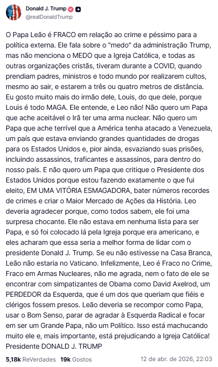 Na mensagem, Trump chamou Leão XIV de “fraco no combate ao crime” e “terrível em política externa”. Também atacou posições do papa sobre Irã e Venezuela, disse que o chefe da Igreja Católica estaria agindo como político e não como líder religioso e afirmou que não quer “um papa” criticando o presidente dos Estados Unidos.