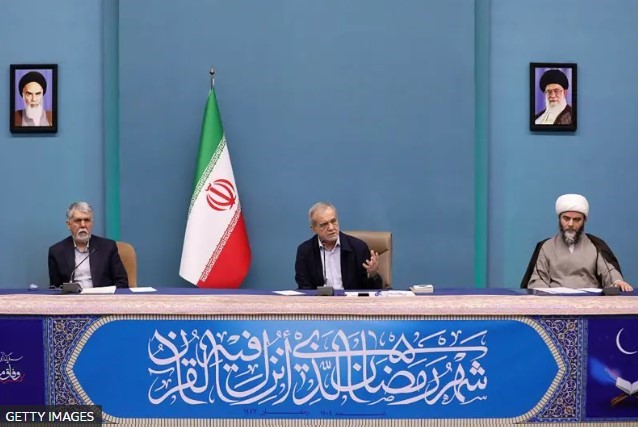 Reprodução/Foto-RN176 Especialistas consideram pouco provável que o presidente Masoud Pezeshkian (centro) ou outras figuras do que resta da cúpula iraniana queiram negociar com os EUA
