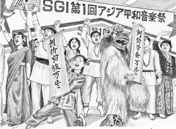 Reprodução/Foto-RN176 1ª Festival Musical pela Paz da SGI da Ásia. Apresentação dos membros de Singapura. Ilustrações: Kenichiro Uchida