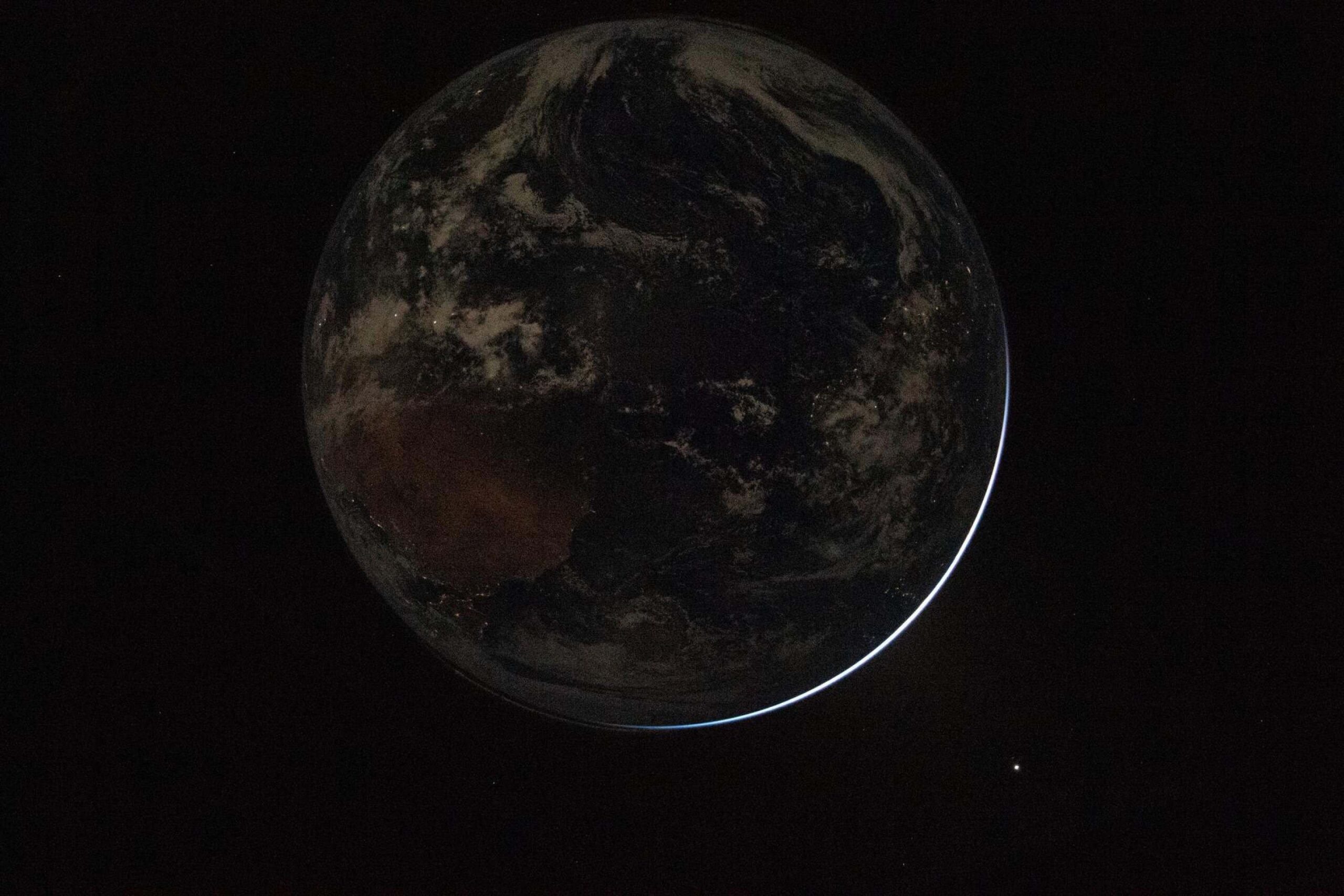 Um dos cliques, realizado pelo comandante Reid Wiseman, destaca diferentes fenômenos visíveis ao redor do planeta. Duas auroras aparecem em regiões opostas — uma no canto superior direito e outra no inferior esquerdo — enquanto a luz zodiacal surge no canto inferior direito, perceptível no momento em que a Terra eclipsa o Sol. À esquerda da imagem, uma área em tom marrom identifica o continente africano.