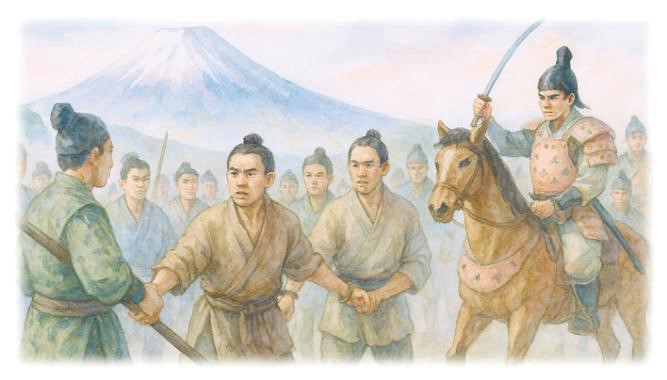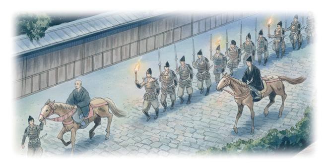 Reprodução/Foto-RN176 Desenho de ilustração do buda Nichiren Daishonin sendo preso e levado pelos soldados de Hei no Saemon-no-jo – ilustração do JBS