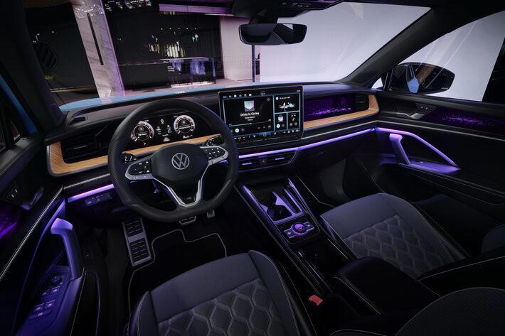 A cabine do Novo Tiguan passou por uma profunda digitalização. O seletor de marchas migrou para a coluna de direção (como na linha elétrica ID.), liberando espaço no console central para o inédito Seletor de Experiências. Por meio deste comando rotativo, o motorista controla o volume, os modos de condução e até a iluminação ambiente (com 30 opções de cores).