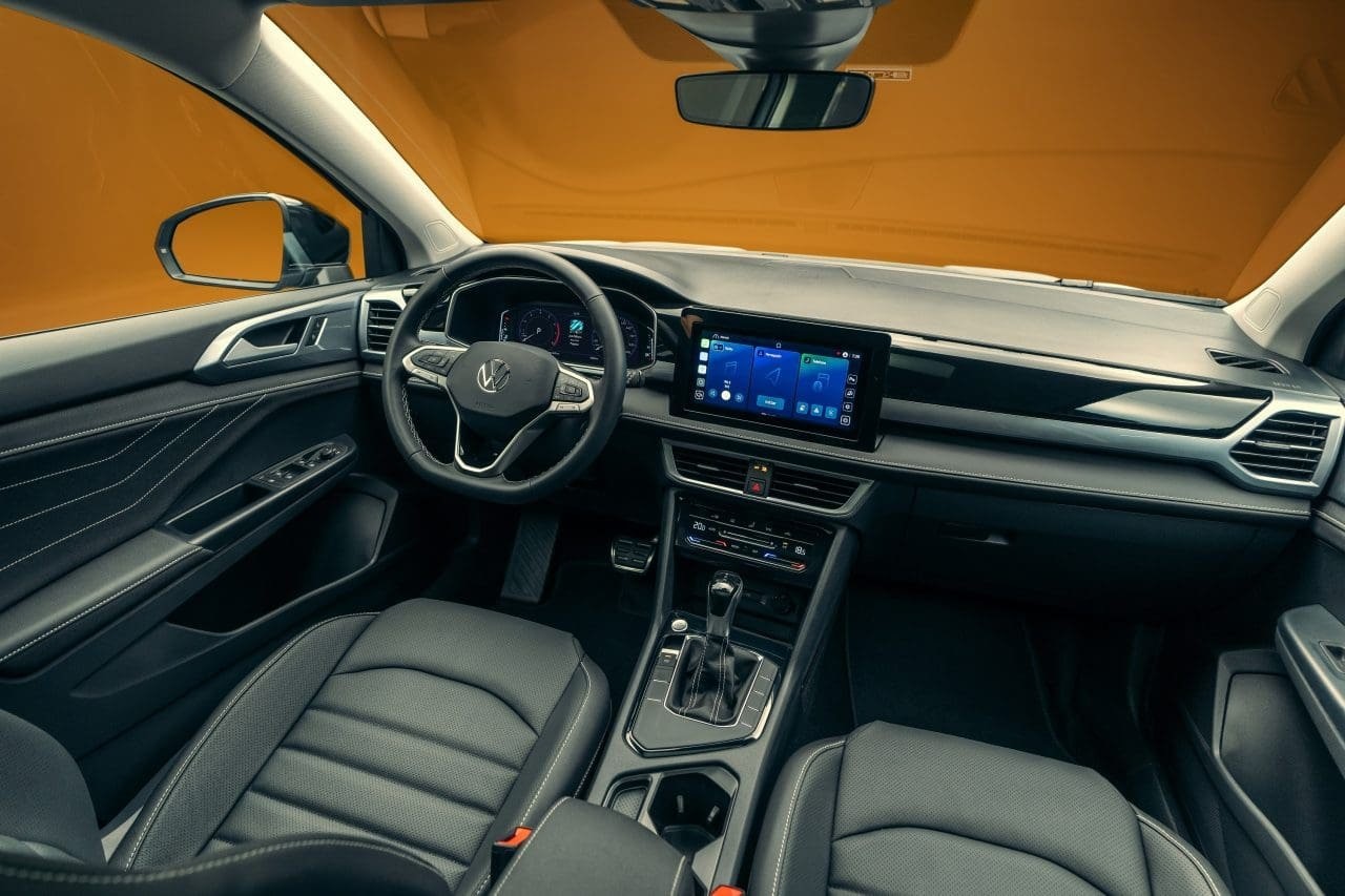 Enquanto isso, por dentro, há a mesma base do painel, porém com saídas de ar, console central e outras partes redesenhadas, mais ou menos como a revitalização feita na cabine do T-Cross a partir da linha 2025. A própria marca assume que deixou a cabine do Taos 2026 mais refinada, aplicando mais materiais macios, costuras aparentes e acabamentos de melhor qualidade, mais uma vez para passar um ar de carro mais premium e chique.
